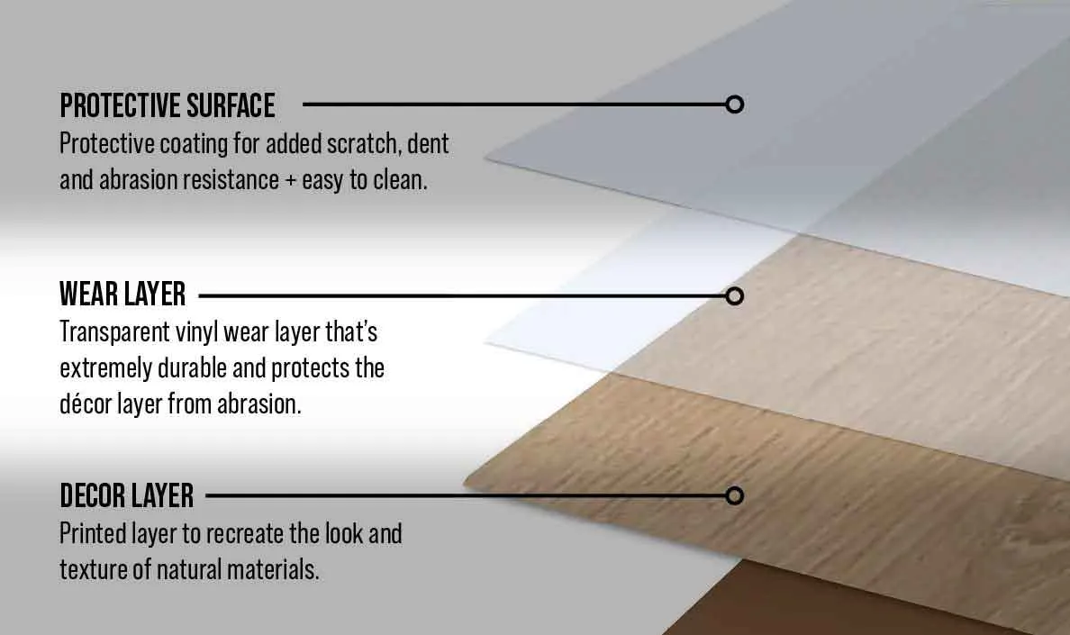 The topmost, protective layer that is designed to withstand everyday wear and tear, as well as provide resistance to scratches, stains, and other potential damage. Vinyl flooring consists of several layers, each serving a specific purpose.